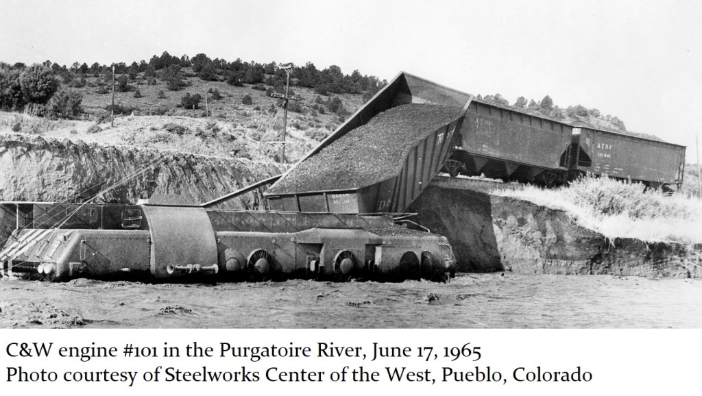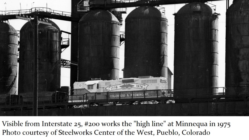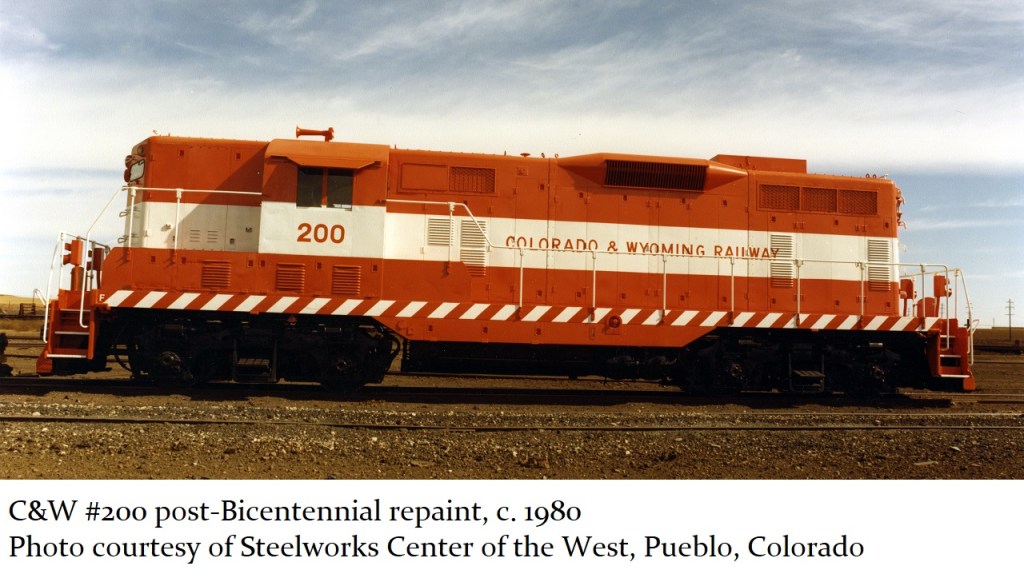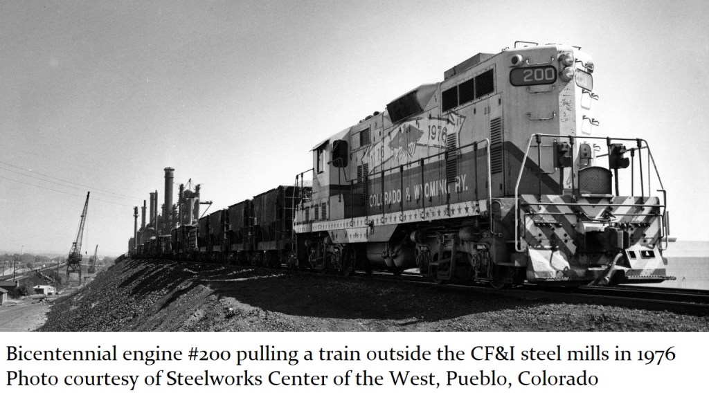 Engine #101 was nearly destroyed by the Colorado floods of June 1965, when the tracks were washed out by the swollen Purgatoire River west of Trinidad. Despite the damage from that accident, the engineers and crew at the Allen Mine shop had the engine back up and running again in six months. That engine, #101, was actually the first engine to get the red, white and blue “Bicentennial” paint job, in April 1975. The blue eagle and red ribbon design, submitted by Bruce Henderson and his daughter Denise, was the winning entry of a contest among C&W employees. Engine #101 was given a new number, #200, in honor of the Bicentennial celebration. Once the Bicentennial was over, the engine still retained the “#200” designation, but was repainted again, back to the standard C&W orange and white color scheme. In the early 80s, engine #200 was sold by the C&W railroad to the Sidney & Lowe railroad, where it was eventually scrapped.