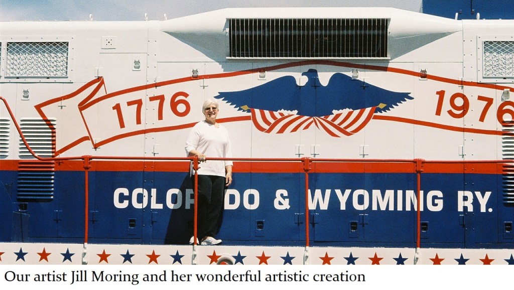 Before the engines could be put to use at the Museum, they first needed a paint job. While engines #103 and #104 would get a recoat of the standard orange and white C&W colors, the PRF wanted something different for #102. The PRF wanted to recreate the same patriotic artwork on #102 that its sister #101 (#200) had so proudly displayed three decades before. But by this time, the Bicentennial design could only be viewed in postcards and photographs. The C&W train shop, where the engines had been kept before being purchased by the PRF, could do a basic paint job, but it could not afford to spend the time and manpower on something as complex as the Bicentennial design. The task of turning engine #102 into the work of art that it is today was taken on by a very special friend of the Foundation – Jill Moring.