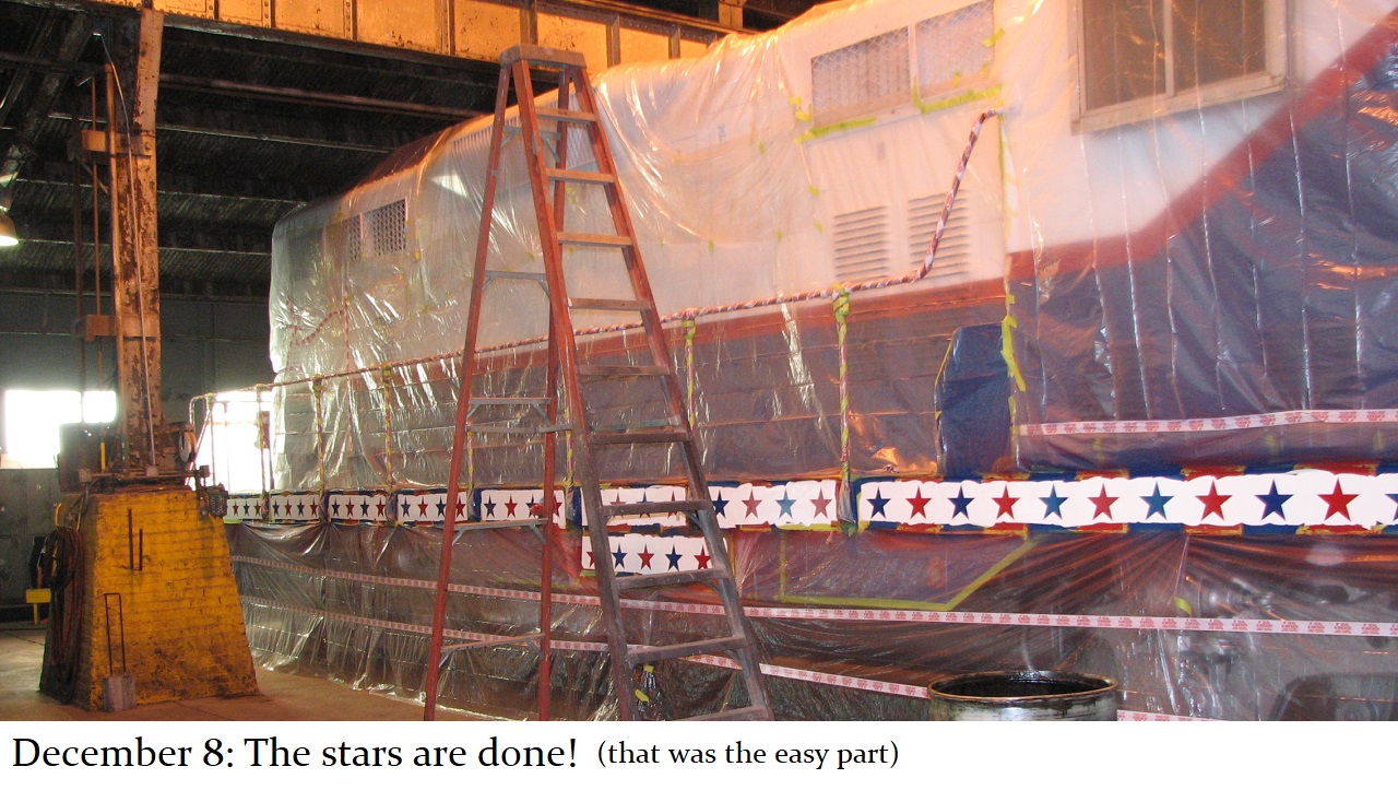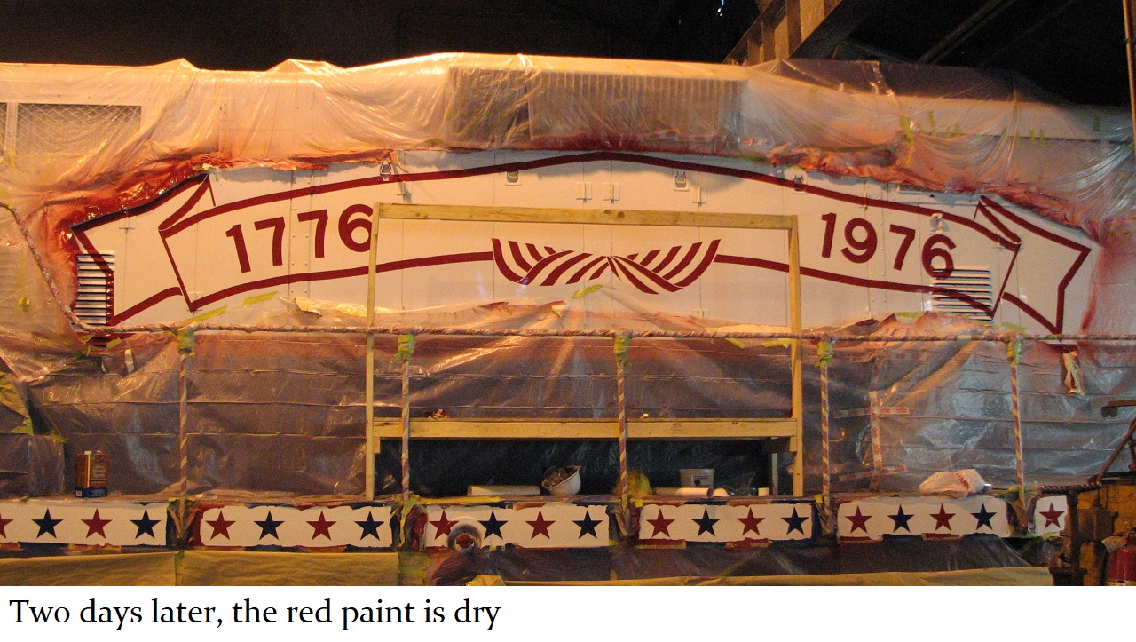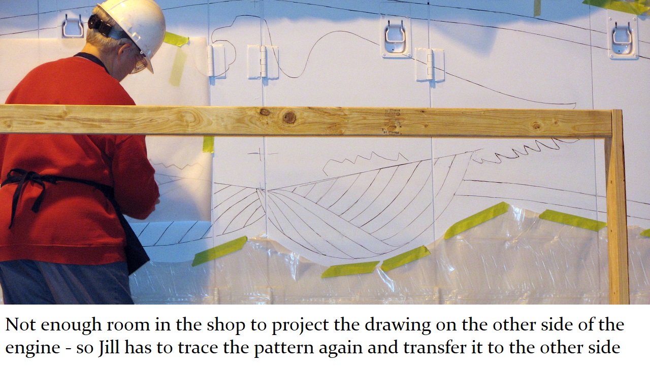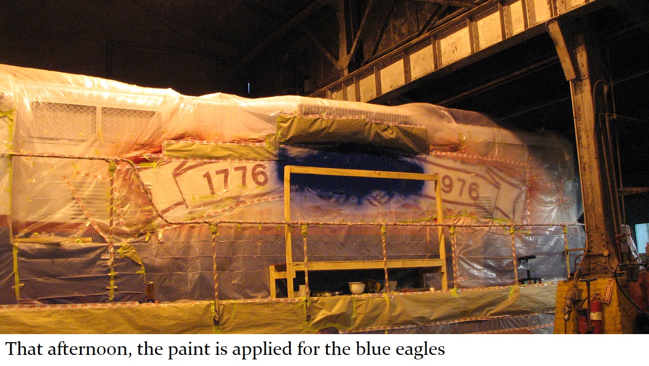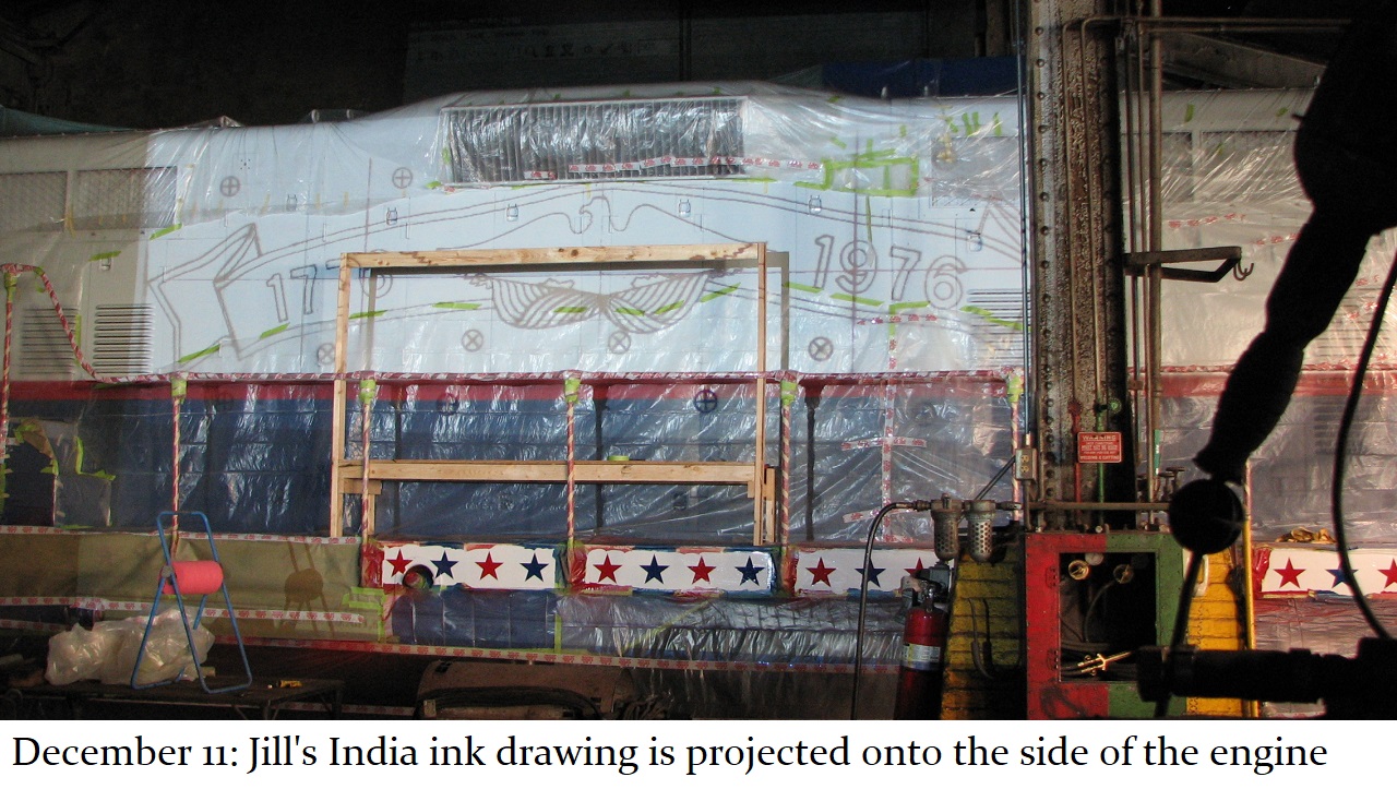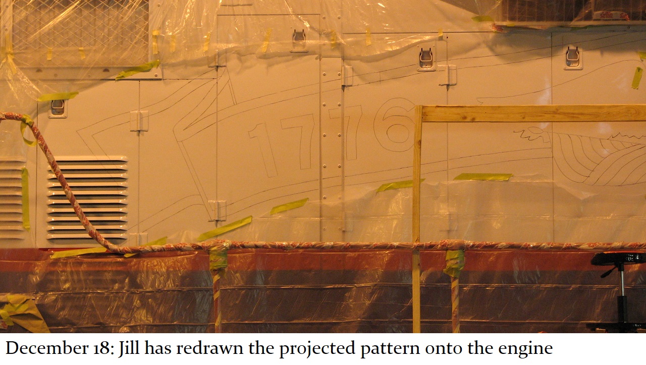 And so a plan was formed. The C&W shop would put on the basic white and blue paint with red striping and trim. Then, the shop would be made available to Jill, and her assistant Howard “Cork” Hayden, to reconstruct the Bicentennial design in their “spare time” over the next several months. Eddie Greenhood, the person who had been the caretaker of the engine when it was owned by C&W, made special accommodations for Jill and Cork to be able to work safely inside the C&W shop. Jill and Cork began this ambitious undertaking in the fall of 2006 and worked five months to complete it.