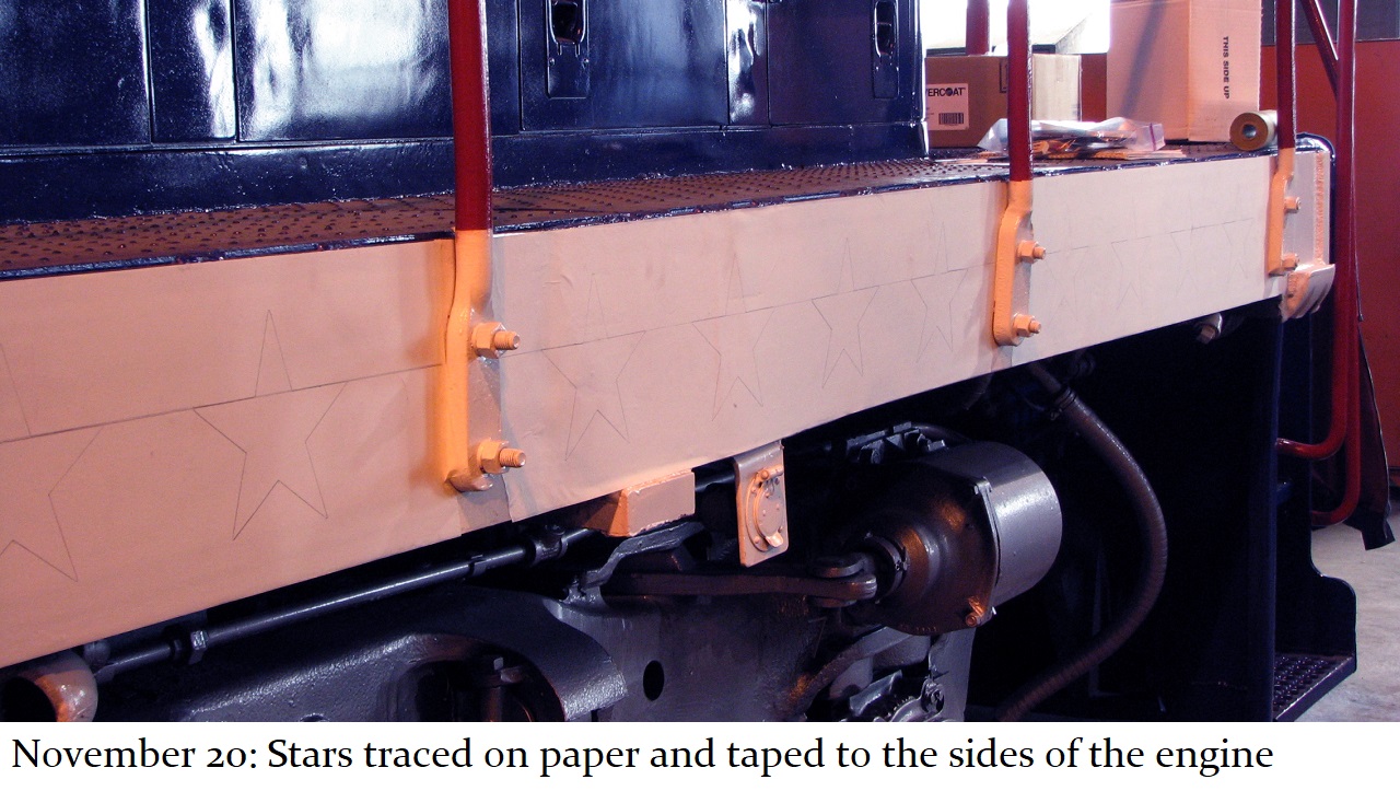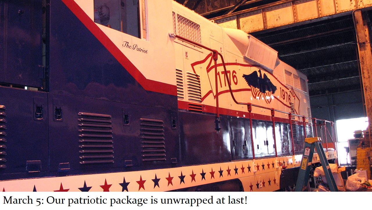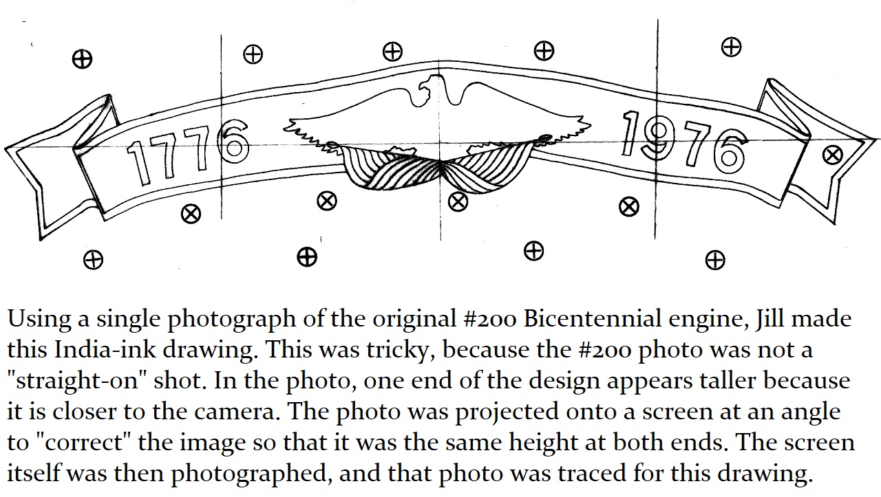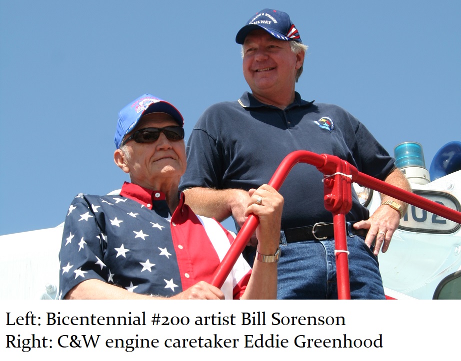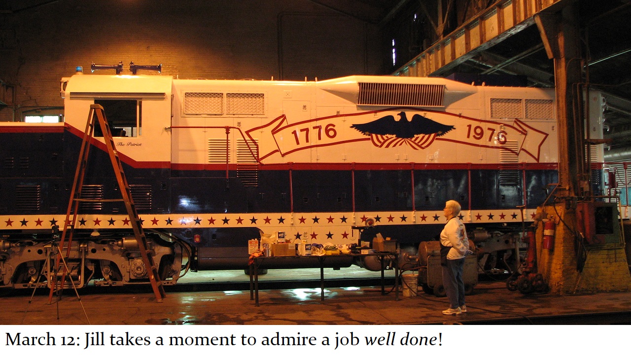 And so a plan was formed. The C&W shop would put on the basic white and blue paint with red striping and trim. Then, the shop would be made available to Jill, and her assistant Howard “Cork” Hayden, to reconstruct the Bicentennial design in their “spare time” over the next several months. Eddie Greenhood, the person who had been the caretaker of the engine when it was owned by C&W, made special accommodations for Jill and Cork to be able to work safely inside the C&W shop. Jill and Cork began this ambitious undertaking in the fall of 2006 and worked five months to complete it.