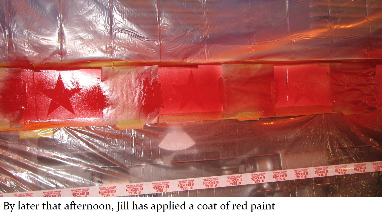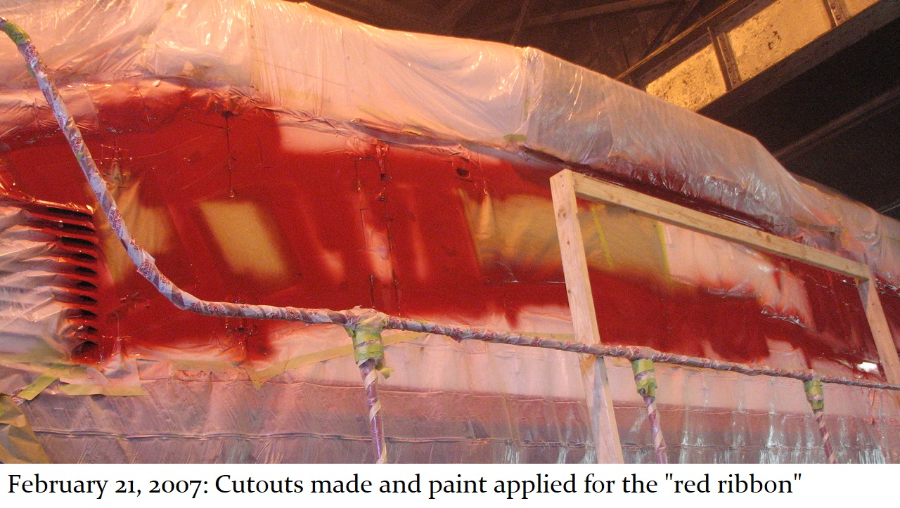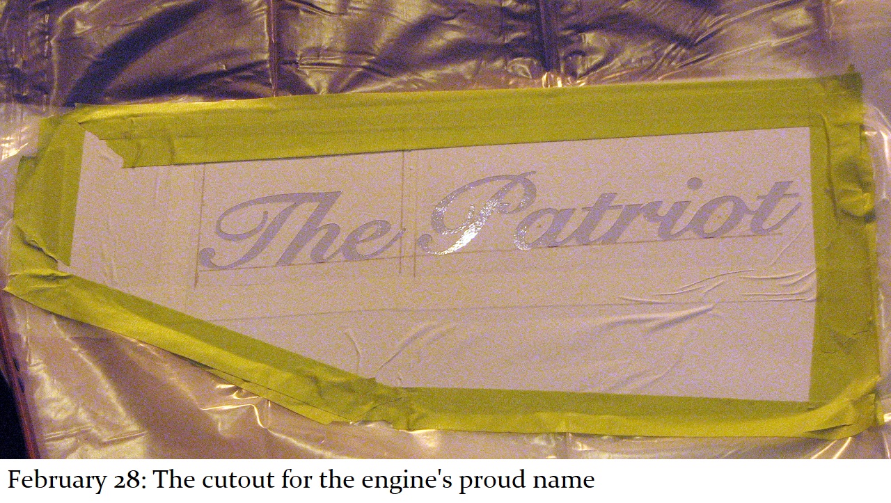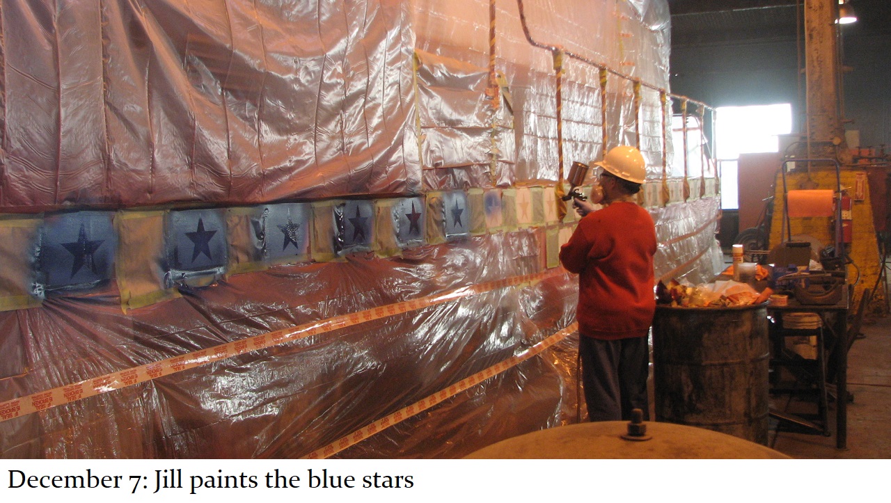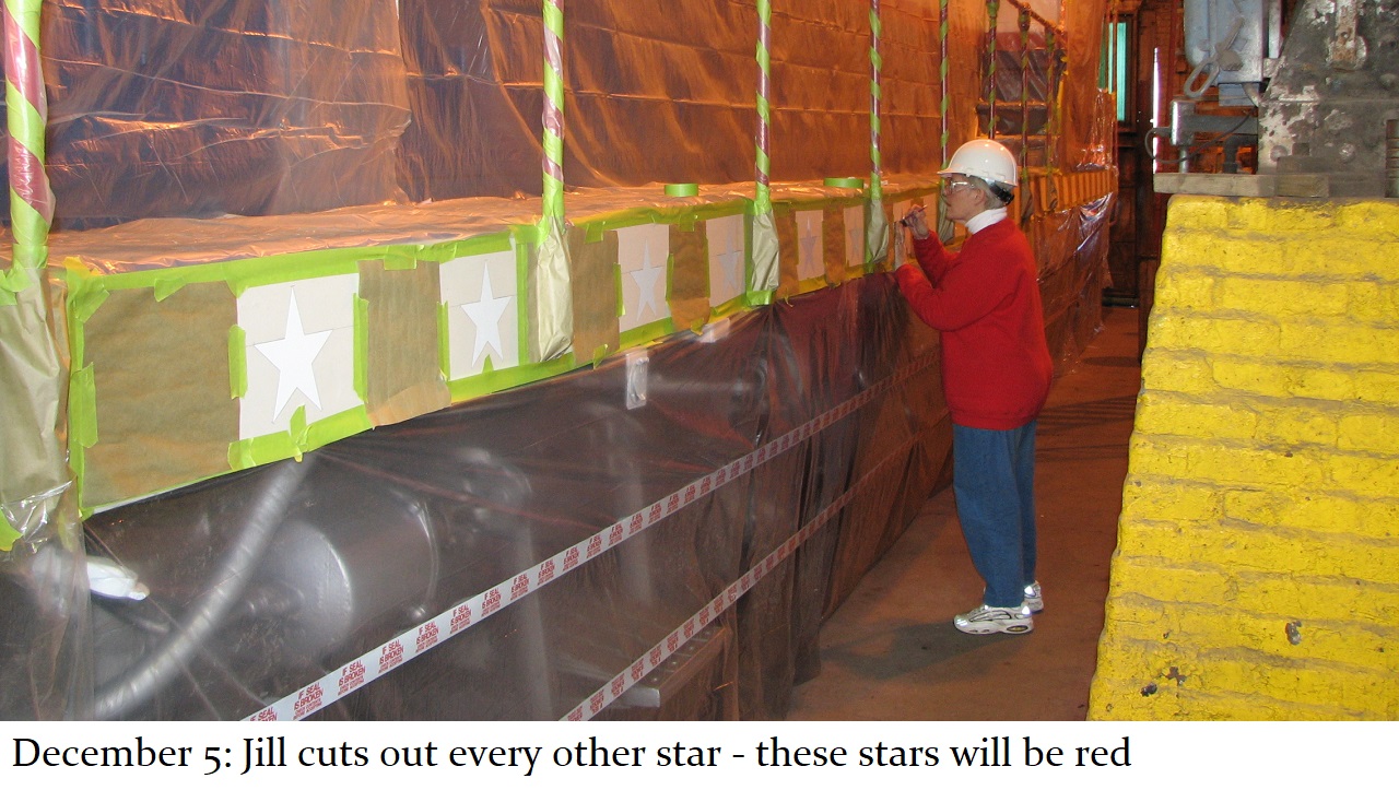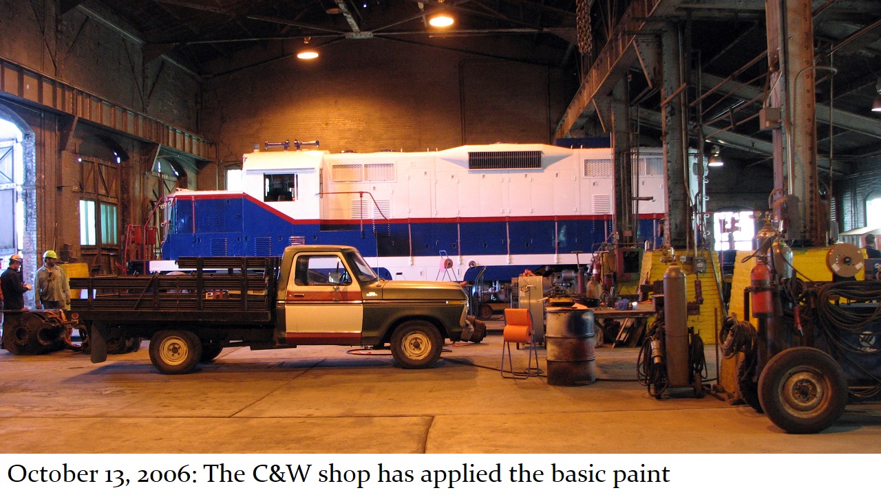 And so a plan was formed. The C&W shop would put on the basic white and blue paint with red striping and trim. Then, the shop would be made available to Jill, and her assistant Howard “Cork” Hayden, to reconstruct the Bicentennial design in their “spare time” over the next several months. Eddie Greenhood, the person who had been the caretaker of the engine when it was owned by C&W, made special accommodations for Jill and Cork to be able to work safely inside the C&W shop. Jill and Cork began this ambitious undertaking in the fall of 2006 and worked five months to complete it.